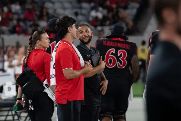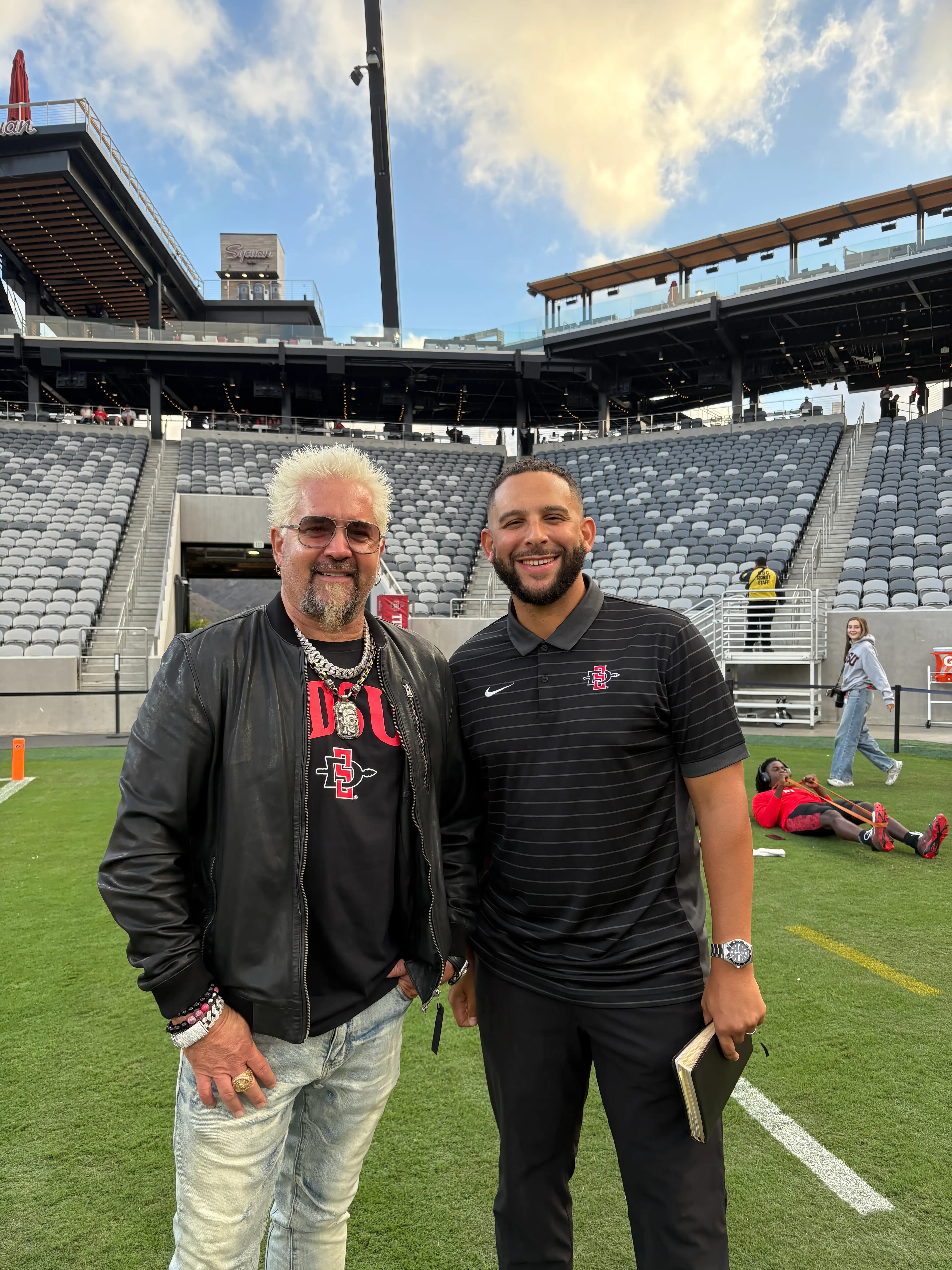 An unexpected bonus to Mitchell’s role is that Guy Fieri’s son is on the SDSU team, and Mitchell recently got to meet the celebrity chef. The two are pictured together on the SDSU Field in the photo on the left.